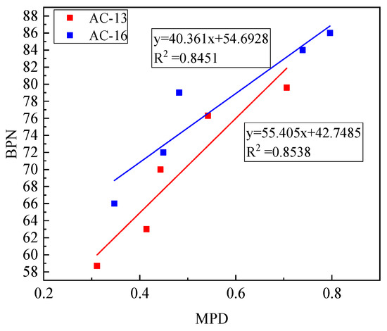 Figure 16 shows the results of fitting the BPN value and MPD of the two mixtures. The results show that the BPN value and MPD also have a good linear relationship. The goodness of fit of the two mixtures is above 0.84. The average section depth of MPD decreases with the decrease of the BPN value. The analysis shows that as the number of aeolian sand increases, the texture depth of the specimen surface gradually decreases, and the surface texture changes passively. At this time, the MPD decreases accordingly.