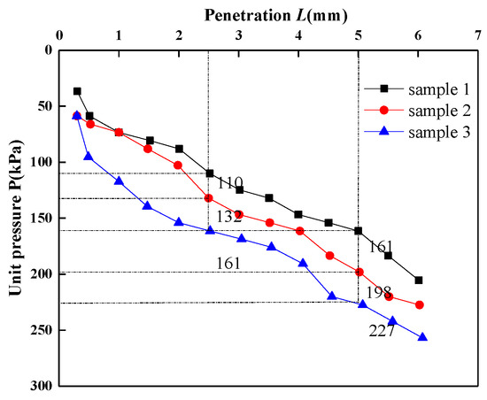 The relationship curve between unit pressure and penetration of lime-solidified manganese slag.