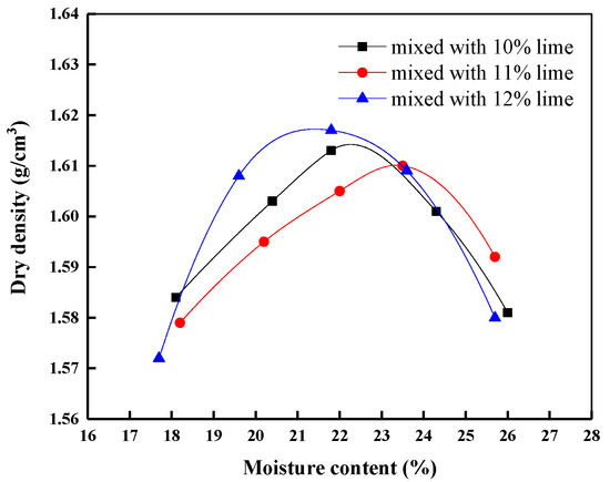 Mix 10%, 11%, and 12% lime into manganese slag, respectively to compact the mixture of lime and manganese slag. The compaction curve of manganese slag with different lime content is shown in Figure 7. With the gradual increase in lime content, the compaction curve gradually shifts to the upper right, indicating that the incorporation of lime increases the optimal moisture content of manganese slag and reduces the maximum dry density. The optimum moisture content of uncured manganese slag is 20.1%, and the corresponding maximum dry density is 1.71 g/cm3. When 10% lime is added, the optimum moisture content is 21.8%, and the maximum dry density is 1.613 g/cm3. With the increase in lime content to 11% and 12%, the optimal moisture content and maximum dry density change little, indicating that when the lime content reaches 10%, the continuous increase in lime content has limited improvement on the compaction effect of manganese slag.