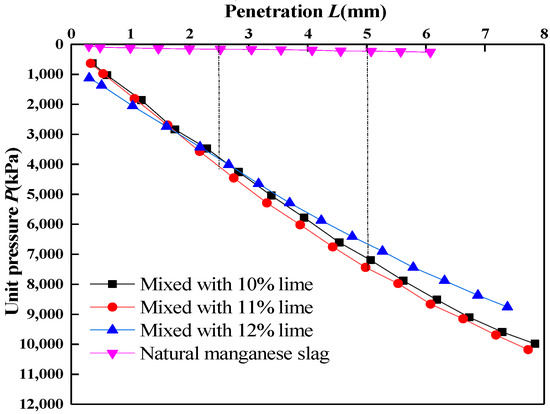 A total of 10%, 11% and 12% lime were added into the manganese slag, and the CBR test was carried out after the lime manganese slag mixture was compacted. The relationship between the penetration amount and the unit pressure under different lime content is drawn as shown in Figure 8. The results were compared with the CBR curves of uncured manganese slag. It can be seen from Figure 8 that with the addition of lime, the required unit pressure increases obviously under the same penetration, which indicates that lime solidifies the bearing capacity of manganese slag. According to the relationship curve between penetration and unit pressure, the CBR value of manganese slag with different lime content is calculated (Table 6).