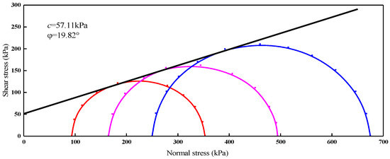 The cohesion and friction angle of manganese slag is determined by the triaxial shear test, it should be noted that manganese slag doped with 10% lime is used for the triaxial test (Figure 10). Salazar et al. presented a new method to measure the volume and volumetric strains of soil specimens during the triaxial test [24]. Mehdizadeh et al. developed a modified triaxial apparatus connected to a water supply system and collection tank to investigate the post-erosion behavior of soil under different loading patterns in undrained conditions [25]. In this study, the data of numerical simulation are from experiments [26]. The manganese slag in this state was solidified in advance. The calculation parameters (Table 7 and Table 8) of the finite element model were measured through the field test.