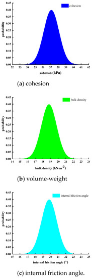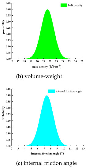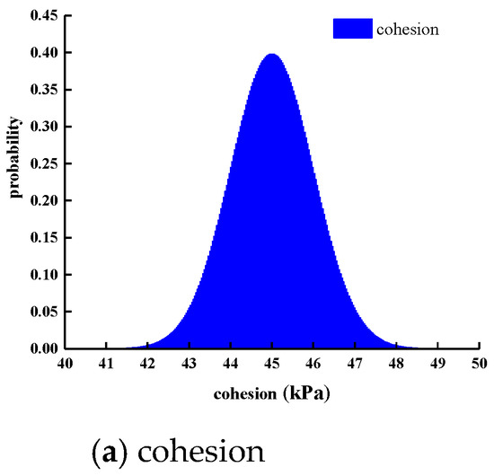 Considering the influence of continuous rainfall, the rainfall intensity in the finite element model is respectively taken as 0 mm/d, 10 mm/d, 30 mm/d, and 50 mm/d. The rainfall duration in the model was set to 10 days, and the total calculation time was set to 30 days. The number of calculation steps was set to 30 steps. Considering the spatial variation in the parameters of the manganese slag slope material, it was assumed that the material parameter distribution obeys the normal distribution, the standard deviation of the parameters was set to 1, the number of Monte Carlo sampling was 2000. The normal probability density functions of the physical and mechanical parameters (cohesion, volume-weight, internal friction angle) of manganese slag and clay layer are shown in Figure 11 and Figure 12.