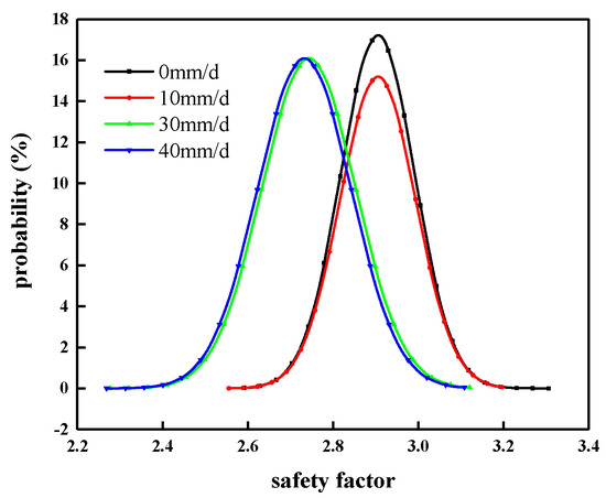 The probability and probability density distribution of the slope safety factor under different rainfall intensities are shown in Figure 13 and Figure 14, respectively. The statistics of various indicators are shown in Table 9.
