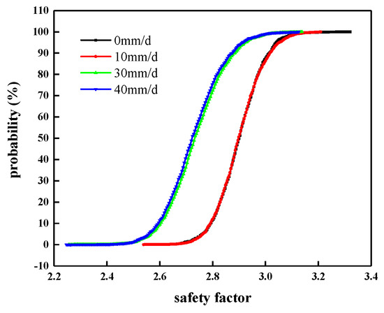 In combination with Figure 13 and Figure 14, and Table 9, it can be seen that under all rainfall intensity conditions, the failure probability of the manganese slag slope is 0, which means that the manganese slag slope is in a safe state at this time. When the rainfall intensity is 0 mm/d, the average safety factor is 2.905, the reliability index is 21.778, the minimum safety factor is 2.573, and the maximum safety factor is 3.323.