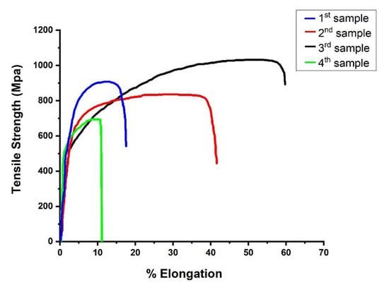 The consequences of welding speed, beam diameter, and laser power upon tensile potency of welded samples are calculated and listed in Table 3. It is observed that ultimate tensile strength (UTS), elongation, and yield strength vary with different process parameters. The fracture position is found in weld region for every case. Figure 3 demonstrates the tensile stress–strain curves of the welded specimens. For Experiment 1 (Blue), the process parameters were: power =500 W, welding speed = 5 mm/s, beam diameter = 0.5 mm. From the Figure, we can see that, for this case, the UTS is 898 MPa, but elongation is significantly less at 19%, and yield strength is 767 MPa. For Experiment 2 (Red), and process parameters were: power = 550 W, welding speed = 6 mm/s, beam diameter = 0.6 mm. From the Figure, we can see that, for this case, the UTS is 811 MPa, but elongation is higher than in previous case at 43%, and yield strength is 660 MPa. For Experiment 3 (Black), and process parameters were: power = 600 W, welding speed = 7 mm/s, beam diameter = 0.7 mm. From the Figure, we can see that, for this case, the UTS is 1007 MPa, but elongation is higher than in the previous case at 62%, and yield strength is 603 MPa, which is lower than in previous case. For Experiment 4 (Green), the process parameters were: power = 650 W, welding speed = 8 mm/s, beam diameter = 1 mm. From the same Figure 3, we can see that, for this case, the UTS is 692 MPa, elongation is 9%, which is very low compared to other cases, and yield strength is 520 MPa. So, for Experiment 3, we can have an optimum process parameter because only in this case did we achieve the highest UTS, and the elongation though yield strength is low. We can conclude that, with the parameters used in Experiment 3, the correct amount of heat input is delivered to the sample, and because of that, it gives the highest strength. When power increases, heat intake by the work piece increases, resulting in more heat penetration, which enhances the chances of deep penetration and wider bead width, resulting in more strength in joints. If the power range exceeds the maximum requirement, then the material can be evaporated due to very high heat, resulting in poor joints that can be easily broken. With an increase in welding speed, the interaction time of the laser beam with the work piece decreases, leading to less heat penetration into work piece, which can be a reason for low strength in joints. Again, if the welding speed is very low, then the interaction time between the laser beam and the work piece increases, which also produces a large amount of heat in the joints due to the same observed material degradation, thus resulting in fragile and brittle joints. As the power density per area decreases with increases in beam diameter, less heat will penetrate the work piece, which leads to less penetration and minor bead width, producing lower strength joints. If the beam diameter decreases, the density of power over the area of joints will increase, thus more heat penetration will occur in joints, which can produce more strength in joints for welding. However, a very small beam diameter will exceed the required amount of heat, which can degrade the joint quality in terms of strength. So, we need to identify the process parameters that can balance the heat input so that only the required, not more and not less, amount of heat can be delivered to the work piece, to obtain high strength as well as more elongation in weld joints. For the process parameters that were used for Experiment 3, the perfect amount of heat was delivered in comparison to the other experimental studies in this paper.