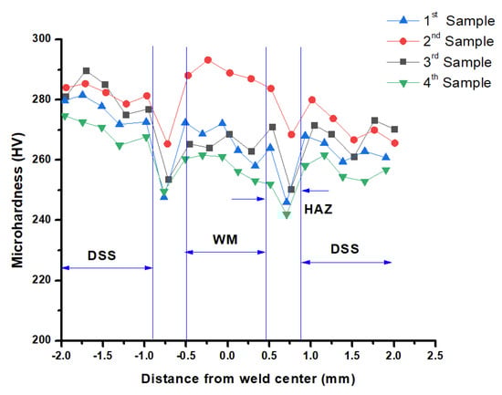 The Vickers microhardness profile of all welded samples through the base material, heat affected zone (HAZ), and weld zone were calculated and graphed in Figure 5. Microhardness values are in the range of 290–300 HV in welded regions, 270–285 HV in the heat affected zone (HAZ), and 250–265 HV in the base metal. It is evident, regarding these figures, that microhardness is decreasing incessantly from the fusion zone to the base material. The divergence of hardness between fusion and base zone is due to switching in metallurgical phase constituents [24]. Formations of greater quantities of intermetallic compounds over and above the development of bainite formation due to a higher cooling rate are also reasons for discrepancy among hardness. A higher cooling rate is capable of restraining the composition of softening in the fusion zone. Due to this higher cooling rate, we can have improved hardness in the fusion zone as an end result [30,31].