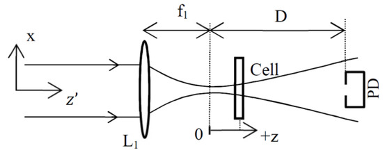 As shown in Figure 2, the basic theoretical setup is composed of a focusing lens L1, a cell containing the liquid to be tested and a photodiode PD placed in the far field . In our study, it is considered the general case that the cell is scanned along the beam direction around the focal plane . Therefore, later we can also find results from the simulation related to the Z-scan method [19] and its derivative [20]. Exposure of the sample to the excitation beam is controlled by a chopping wheel placed before L1 and not shown in this simplified arrangement. The absorption of the fused silica composing the cell is considered to be negligible and its thickness lower than the Rayleigh range .