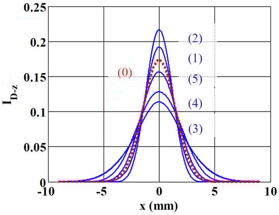 with being the beam waist at . The other parameters were defined as follows: , z varies from to in increments of . The intensity profiles obtained from the simulation are shown in Figure 3, where we can see the profile labeled (1) for , (2) for , (3) at the bottom of the figure for , (4) for and finally (5) for . The (0) labeled profile is obtained with no thermal lens effect (. Its diffracted beam-waist was measured from the simulation profile to be while theoretically . Scanning the cell from negative to positive z values, the peak intensity as shown in profiles (1) and (2) first increases and then suddenly decreases (3), and finally its value increases again in (4) and (5). This is typical behavior of the Z-scan method with negative phase shifts, which show a higher transmittance at pre-focal positions followed by a lower transmittance at post-focal positions [19]. Moreover, at this point note that the relatively high considered phase shift ( is possible when using Helmoltz formalism for the beam propagation (or , its equivalent in the spectrum domain). No simplifications or approximations are usually made in the literature with diffraction theory (as for example in [15,16,17]) and there are no such stringent conditions on the propagation distance, which can be in the near field. Moreover, we take into account the basic equation describing the effect of the lensing medium (Equation (3)) and not a limited second order expansion assuming a small phase shift . In addition, the radius of curvature of the spherical wave of the Gaussian beam is often approximated to a parabolic one in the previous references, which limits the analysis of the final intensity to values near the optical axis. In our case, this approximation does not exist and therefore we can study the entire transverse profile of the output beam and accurately measure its diameter with a CCD camera.