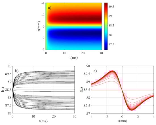 Before analyzing the effects of the above approximations on the final measurement, we will introduce a spatiotemporal image showing the central intensity of the output beam () when varying and , the integration time on the photodiode. The used parameters to generate the results must allow comparison with those of references [15,16,17] in particular to be valid and consistent with the simplifying assumptions. Therefore, let us define It is appropriate that this parameter remains sufficiently small because in most experiments invoking thermal lenses using the established analytical relations, is of the order of 0.1 or less. Therefore, we considered the parameters shown in Table 1 with varying from 0 to and z from −Z to +Z on 50 and 51 samples, respectively. We also considered the Fresnel reflections on the cell by considering the refractive index of its glass walls and we have chosen the size of the beam-waist corresponding to the output of most CW lasers.