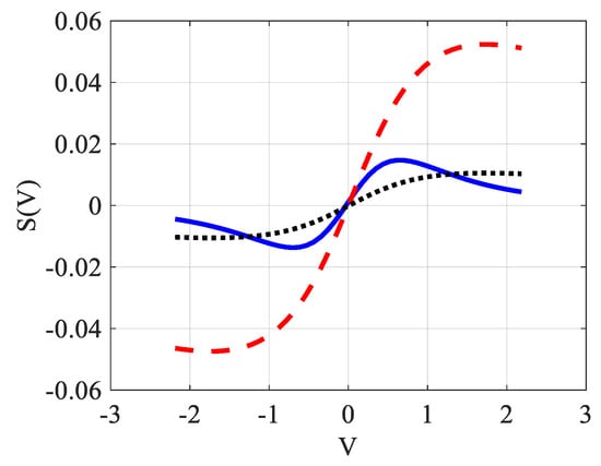 We also notice that the maximum and minimum of the signal given by the solid blue line (obtained without resorting to approximations) and the analytical function defined in Equation (6) do not give the same values. Indeed, as already mentioned, Equation (6) is obtained following a rather rough calculation, so it is not surprising to see that its extremums also do not correspond exactly to the correct values that are obtained around , separated therefore by a distance .
