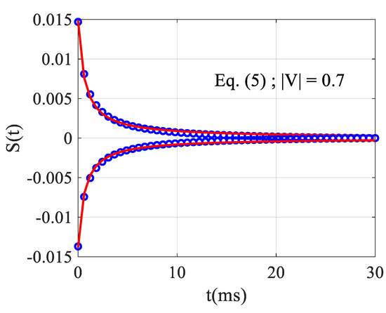 We can now study Equation (7) or its analogous Equation (5) using the correct values for the maximum and the minimum. We have used a nonlinear least squares routine to fit the temporal behavior at these positions obtained with the exact numerical simulation as if they were experimental acquisitions. At the minimum, for , we obtained and , while at the maximum, for , we obtained and . It should be noted that a small difference is observed in the fitting results when moving from negative to positive because the response is not symmetrical (see Figure 6 for ). This asymmetrical response is much more pronounced for higher absolute values of . In any case, the mean measured value is given as: and which always underestimates the correct values ( and , respectively) with relative errors of 60% on and 35% on .