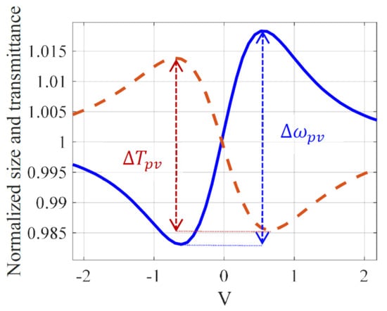 We will end this analysis by providing the relationship between the induced phase shift and the signal it generates in a single beam stationary mode. As already shown in the 4f setup [20], we can then measure the variation of the beam size at the output of an imaging system or directly, following the scheme in Figure 2. Indeed, the 4f setup acts through its second lens, forming the image as a far field diffraction, provided that . In the presence of a Gaussian beam, we checked that the relations obtained for the relative size variation of the output beam would be the same with or without this second lens. Therefore, to minimize the numerical calculation, we will present the results relative to the simplified scheme in Figure 2, knowing that the same relations would be obtained in the 4f system. The parameters of Table 1 will always be considered. Figure 7 shows the numerical simulation of the Z-scan trace, in the dashed (red) line, along with the relative size variation of the beam, in the solid (blue) line, measured using the D4σ method as in [20]. Based on the calculation of the second order moment of the diffracted beam, the D4σ method gives four times the standard deviation of the intensity profile distribution. The difference between the peak and the valley is a linear function of the induced phase shift as already shown experimentally in [10] using a CCD at the output of a 4f system. Using D4σ method we found: with where represents the size of the beam in the presence of the TL and without, i.e., in the low TL regime. Furthermore, the relation obtained for Z-scan linking the signal to the induced phase shift in the center of the beam at (with a closed aperture sensing the maximum of the intensity profile) is . The sensitivity is defined as the ratio of the output of a measurement system with respect to an input. The coefficient 0.14 found here is in good agreement with that found in the literature. According to [25], the sensitivity of Z-scan in the steady-state regime is 0.15.