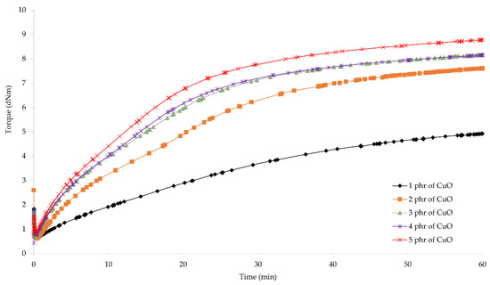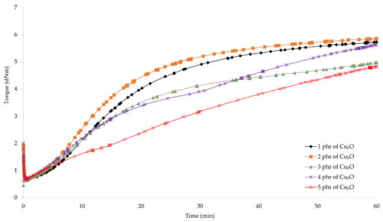Torque increment after 45 min of heating of the CR/Cu2O-5 was the largest and equal to 3.91 dN · m. With the decreasing amount of Cu2O in the compounds, the value of the torque increment also decreased, reaching the value of 2.63 dN · m for the CR/Cu2O-1. For the compositions containing copper(II) oxide, the greatest value of torque increment after 45 min of heating was obtained for the CR/CuO-5 (ΔM45 = 2.65 dN · m). For the application of the copper(II) oxide, with the decreasing amount of CuO in the composition, the torque increment also decreases, as in the case of Cu2O. For the CR/CuO-1, ΔM45 = 0.88 dN · m. The CR without any metal oxide obtained the value of ΔM45 = 1.86 dN · m, while, for the CR containing the standard cross-linking system, ΔM45 = 3.77 dN · m.