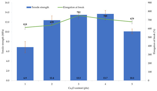 The performed tests showed that the amount and type of copper oxide affect the mechanical properties of CR vulcanizates. The thermo-cross-linked CR sample obtained the tensile strength value equal to 1.9 MPa, which was the lowest value among all tested samples. For the CR/Cu2O-1, TSb = 6.9 MPa (Table 4, Figure 3), whereas the incorporation of at least 2 phr of Cu2O results in increasing the vulcanizates tensile strength to values in the range from TSb = 10.1 MPa for the CR/Cu2O-5, to TSb = 13.7 MPa for the CR/Cu2O-4. A similar dependence can be observed for vulcanizates containing CuO. The incorporation of 1 or 2 phr of CuO causes a tensile strength value of less than 7 MPa (Table 4, Figure 4), whereas, incorporation of at least 3 phr of CuO leads to increasing the TSb to at least 12.1 MPa (for the CR/CuO-4), up to 14.3 MPa (for the CR/CuO-5). For comparison, CR cross-linked with ZnO and MgO was characterized by TSb = 7.8 MPa, which is slightly higher than the tensile strength values of vulcanizates containing small amounts of copper oxides.