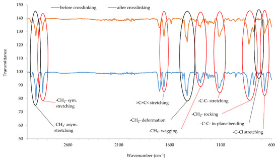 Infrared spectra confirmed that copper oxides can cross-link the CR compositions. An increase in the intensity of the peaks at the wavenumbers of 2915 and 2847 cm−1 corresponds with the stretching of -CH2-, asymmetric and symmetric, respectively (Figure 5 and Figure 6). The decreasing intensity of the absorption peak at the wavenumber of 1655 cm−1 (>C=C< stretching) may indicate the formation of bonds between elastomer macromolecules, by breaking the double bonds in the CR chain. Medium and strong peaks at the wavenumbers 1471 and 1428 cm−1, respectively, are attributed to -CH2- deformations. Shifts in the intensity of these bands indicate the changes taking place in CR during its heating in the presence of copper oxides. Changing intensity of the absorption peak at the wavenumber of 1296 cm−1 corresponds with the wagging of -CH2-. In turn, the change in band intensity at wavenumber 1109 is attributed to the C-C stretch of the CR main chain, which can provide the reorganization of structures when the blends were heated in the presence of copper oxides. The decreasing intensity of the absorption peak at the wavenumber of 822 cm−1 is attributed to -CH2- rocking corresponds with the changes in methylene groups shown in other bands. The absorption peak at the wavenumber of 727 cm−1 is attributed to in-plane bending of -C-C- bonds in CR main chain. The decreasing intensity of the absorption peak at the wavenumber of 668 cm−1 (-C-Cl stretching) clearly illustrates that, when the CR is heated in the presence of copper oxides, the elastomer cross-links.