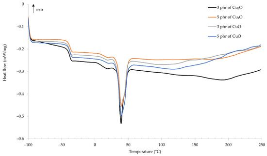 Using the differential scanning calorimetry allowed us to determine the glass transition temperature of the compositions. For all tested samples, the glass transition temperature was approximately −38 °C (Figure 7). For the CR/Cu2O-3: Tg = −38.51 °C, for the CR/Cu2O-5: Tg = −38.15 °C, for the CR/CuO-3: Tg = −38.72 °C, and for the CR/Cu2O-3: Tg = −37.95 °C. Almost identical glass transition temperatures prove that the type and amount of copper oxide do not influence this parameter. For comparison, standard cross-linked CR has a glass transition temperature ranging from −50 to −40 °C [41,42]. This proves a slight influence of copper oxides on increasing the glass transition temperature of the CR composition. At the temperature of ~39 °C, a significant endothermic peak appears, which proves the melting of the crystalline structures formed over time in chloroprene rubber during its storage. Up to the temperature of ~100 °C, the characteristics of the curves are almost identical for all tested samples. Above this temperature, the characteristics fluctuate, which indicates changes in the material depending on its composition. In the temperature range from 125 to 179 °C, an exothermic peak appears, which proves that the composition is cross-linked by copper oxides. In the case of samples containing copper(I) oxide, the exothermic peak is wider. For the CR/Cu2O-3, the peak is in the range of 126–179 °C with a maximum at 151 °C. However, for the CR/Cu2O-5, the peak is in the range 135–165 °C, with the maximum temperature at 151 °C. For the CR/CuO-3, the width of the exothermic peak is smaller and is in the temperature range 128–152 °C with a maximum at 141 °C. In turn, for the CR/CuO-5, two peaks can be observed—the first at a maximum of 136 °C, and the second at 211 °C. From the obtained results, it can be observed that the type and amount of copper oxide affects not only the cross-linking of the composition but also causes changes in the structure of the entire material along with a further temperature increase in the system.