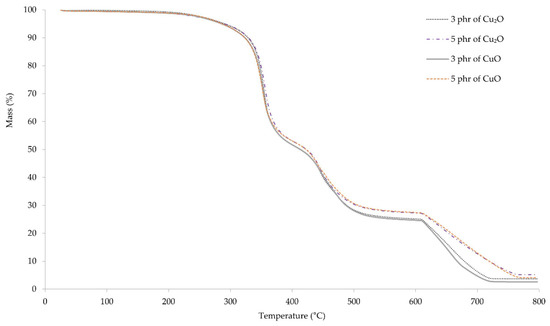 Thermogravimetric curves allowed us to determine the processes occurring in vulcanizates during their heating. The first weight loss of the samples occurs at a temperature range 368–373 °C, where the pyrolysis of the material begins (Figure 8). The weight loss of the samples was in the range of 26–29%. The second stage of pyrolysis occurs at the temperature range of 463–466 °C. The weight loss of the samples in this stage was also about 30%. At the temperature of ~660 °C, carbon black formed during pyrolysis, combusts as a result of changing gas from argon to air. The course of the thermogravimetric curves up to the temperature of ~500 °C is almost identical. Above this temperature, it can be observed that the weight loss of samples containing 3 phr of copper oxides is greater than that of samples containing 5 phr. This may result from the lower amount of organic components that may remain unburned at higher temperatures.