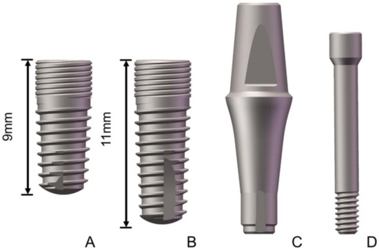 Structure diagram of the tested samples ((A): 9 mm implant; (B): 11 mm implant; (C): abutment; and (D): abutment screw).