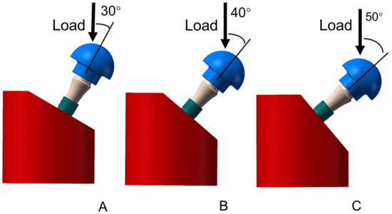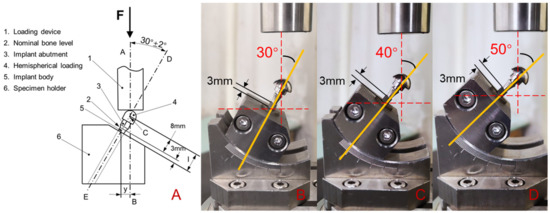 The 3D models were created by SolidWorks 2016 software (Dassault Systèmes SolidWorks Corp., Concord, MA, USA) according to the design and size of the implant samples. As shown in Figure 3, implants of different lengths were inserted into the metal block at 30°, 40°, and 50° off-axis. The load direction was identical to the axis of the fixture.