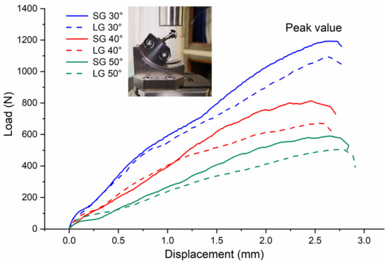 After the static failure test, all the samples showed irreparable plastic deformation at the connection between the metal fixture and the implant. Table 3 lists the lever arm, failure load, and bending moment changes for three loading angles. In the correlation analysis of the failure load and bending moment values of the three angles, it was found that the SG and LG at loading angles of 30° and 40° showed statistically significant differences (p < 0.05 between the groups at the same loading angle), while no significant differences were detected between the SG and LG at a loading angle of 50° (p > 0.05). As the external load increased, the deformation of the implant system increased accordingly. Failure occurred when the deformation exceeded the material limit. The loading process of different specimens is shown in Figure 4, and the peak value represents the maximum load before failure. The SG had a greater failure load than the LG, and as the loading angle increased, the failure load value decreased. From the calculation results of the bending moment, the SG also had a larger bending moment, and the bending moment values of the SG and LG gradually decreased as the loading angle increased.