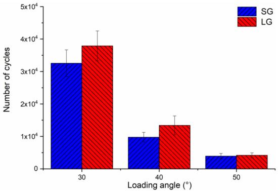 After the fatigue life test, all samples showed irreparable brittle fractures at the connection between the metal fixture and the implant. The fatigue life test results are shown in Figure 5. As the loading angle increases, the number of cycles gradually decreases. When the loading angle is 30°, there is a large difference in the number of cycles. When the loading angle increases to 50°, the difference in the number of cycles decreases. The length of the implant affects the fatigue life. The LG experiences more cycles than the SG. There is no significant difference between the groups at the same loading angle (p > 0.05).