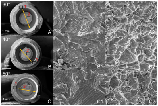 SEM images of the fracture surfaces of the SG: (A–C) Integral morphology; (A1–C1) area shown by “1”; (A2–C2) area shown by “2”. The arrow indicates the direction in which the fracture extended.