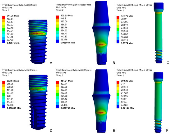Equivalent stress distributions of the implant, abutment, and abutment screw with loading angles 30°: SG (A–C) and LG (D–F).