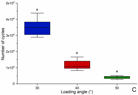 Figure 10 was the box plot diagram of the static failure load, bending moment and fatigue life under three loading angles. Compared with the loading at 30°, the static load failure value is reduced to 67% and 51% at 40° and 50°, respectively (Figure 10A). The failure load is significantly different (p < 0.05 among groups) among the three loading angles. As shown in Figure 10B, the increase in the loading angle changes the bending moment value, but it is not obvious compared with the static load failure. Compared with the scenario of loading at 30°, the bending moment values are at 40° and 50°, which drop to 87% and 78%, respectively. There is no significant difference in the bending moment value between the loading angles of 40° and 50°, but there are significant differences (p < 0.05 among groups) between the other two groups of loading angles. As shown in Figure 10C, the increase in the loading angle significantly reduces the fatigue life. Compared with the loading at 30°, the fatigue life values are reduced to 33% and 11% at 40° and 50°, respectively. There are significant differences (p < 0.05 among groups) in the number of cycles among the three loading angles.