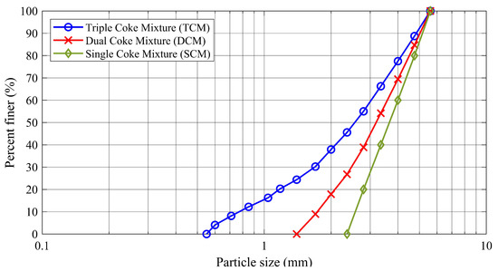 Hence, three different types of mixtures, RVE3000SCM, RVE3000DCM, and RVE3000TCM, were used. RVE3000 represents the representative volume element, which has 3000 large particles, SCM, DCM, and TCM demonstrate the presence of coke particles with different sizes. SCM is a single coke mixture (coke 4–8 US Mesh), DCM is a dual coke mixture (cokes 4–8 US Mesh and 8–14 US Mesh), and TCM is a triple coke mixture (cokes 4–8 US Mesh, 8–14 US Mesh, and 14–30 US Mesh).