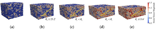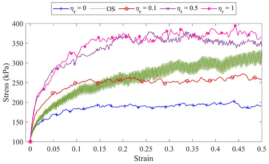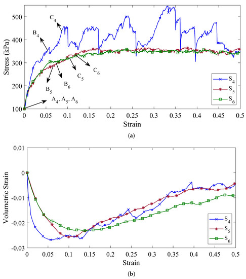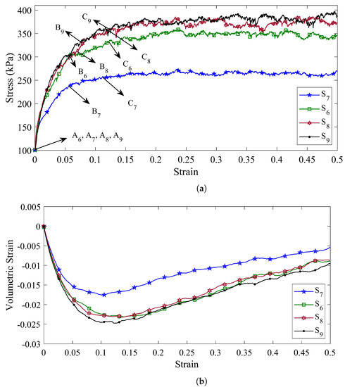 Figure 6a,b represents the shear stress and the volumetric strain versus the axial strain, respectively, for specimens to . Due to the rolling resistance between the particles in these specimens, it is observed that the ability of the specimens to achieve higher stresses increases, and the mechanical behavior of the specimens are more different from each other.