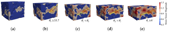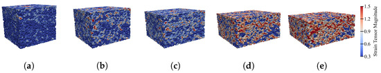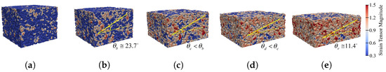 In the previous section, it was shown that the mechanical behavior of the coke aggregates is strongly dependent on the particle shape parameter. Hence, in this section, the effects of the rolling friction coefficient as a parameter of particle shape on the stress–strain diagram and volumetric strain–strain diagram are also investigated. To achieve this goal, four specimens (specimens to ), which are made of a triple mixture of coke (RVE3000TCM), are taken into account. Figure 7a,b represent the axial stress–axial strain and volumetric strain–axial strain, respectively, for the specimens with different rolling friction coefficient ().