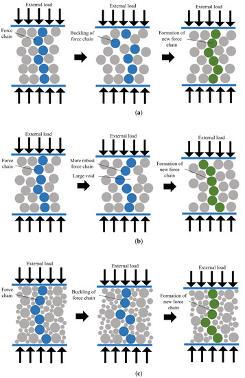 Jiang et al. [37] numerically investigated the effect of particle size distribution on the granular material behavior in a triaxial test. They showed that specimens with narrower particle size distributions experienced higher shear strength and dilatation than those with wider particle size distributions. Moreover, they also attributed the strength of materials in the critical region to the shape of the particles rather than to the size distribution of the particles. Although extensive research has been conducted to investigate the effects of particle size distribution on the mechanical behavior of granular materials, especially in soil mechanics, the role of particle size in the failure of the granular materials is still debatable.
