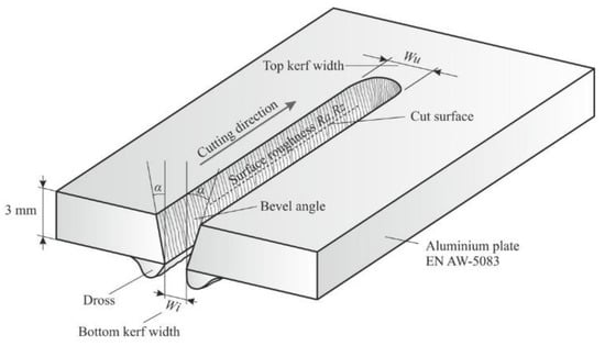 Cut quality responses that were investigated are top kerf width Wu (mm), bevel angle α (°), surface roughness Ra (µm), Rz (µm), and material removal rate MRR (mm3/min), as shown in Figure 2.
