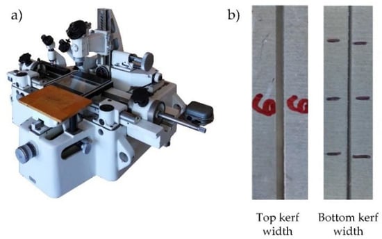 (a) Universal Toolmaker’s Microscope and (b) example of top and bottom kerf width.