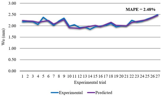 Prediction accuracy of developed model was checked by comparison between predicted and experimental top kerf width data. Figure 5 shows that developed regression model has high accuracy in estimating top kerf width with a calculated MAPE of 2.48% and R2 of 0.822. In order to check significance of each parameter on top kerf width ANOVA was conducted. ANOVA results are presented in the Table 6.