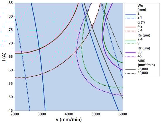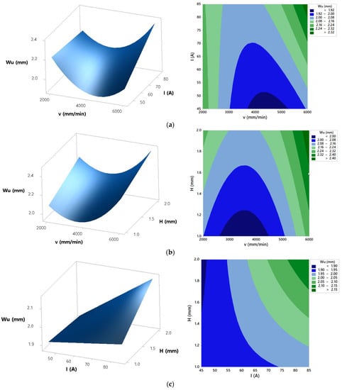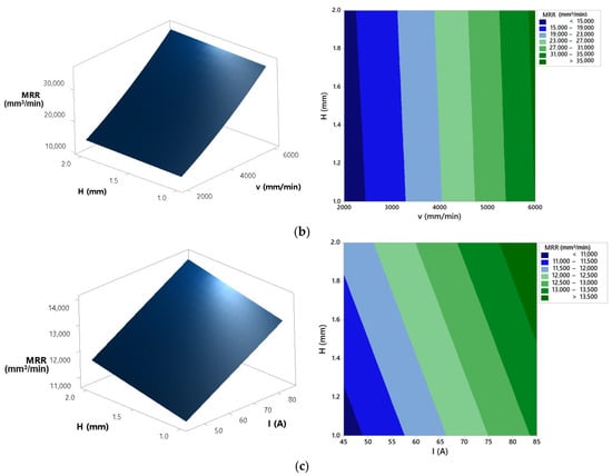 Generated model was used to analyze the effects of process parameters on the material removal rate. In order to do that, response surfaces and contour plots were created, as shown in Figure 14.