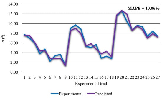 Figure 7 shows that developed regression model has high bevel angle prediction accuracy with the MAPE of 10.06% and R2 of 0.957. In order to check significance of each parameter on bevel angle, ANOVA was conducted. ANOVA results are presented in Table 7.