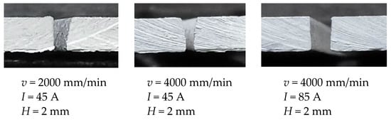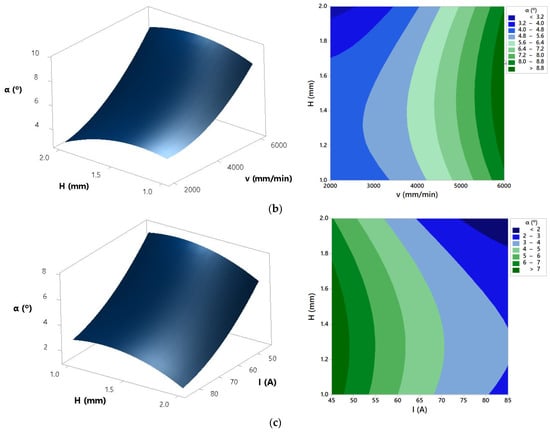 Effects of process parameters on bevel angle: (a) H = 1.5 mm, (b) I = 65 A, and (c) v = 2000 mm/min.
