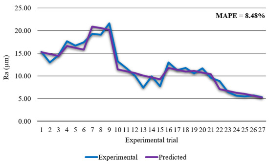 From Figure 9 it is visible that developed regression model has high prediction accuracy of surface roughness Ra with the MAPE of 8.48% and R2 of 0.935. ANOVA was performed in order to check significance of process parameters and their interactions on surface roughness Ra. ANOVA results are shown in Table 8.