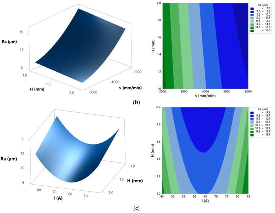 Effects of process parameters on surface roughness Ra: (a) H = 1.5 mm, (b) I = 65 A, and (c) v = 4000 mm/min.