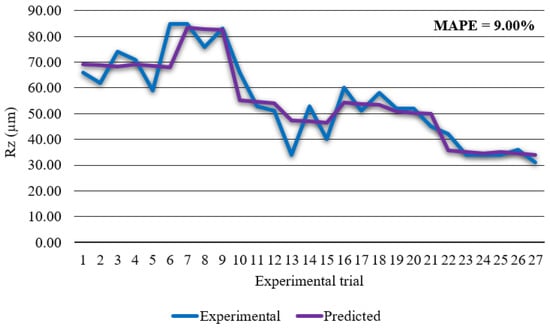 From Figure 11 it can be derived that mathematical model for surface roughness Rz has high prediction accuracy with calculated MAPE of 9.00% and R2 of 0.854. In order to define contribution of each process parameter or even their interactions ANOVA was performed. Results of ANOVA are visible in Table 9.