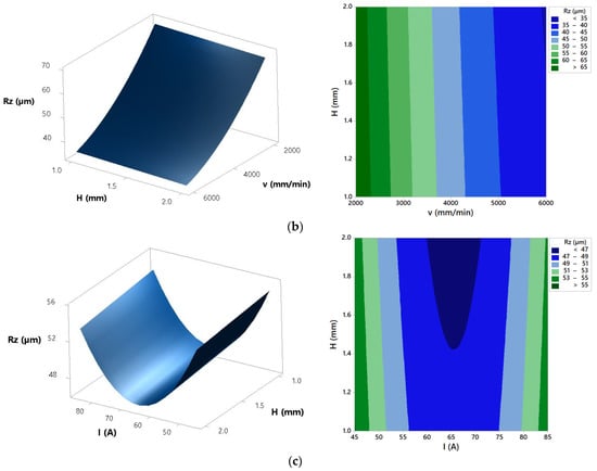 Effects of process parameters on surface roughness Rz: (a) H = 1.5 mm, (b) I = 65 A, and (c) v = 4000 mm/min.