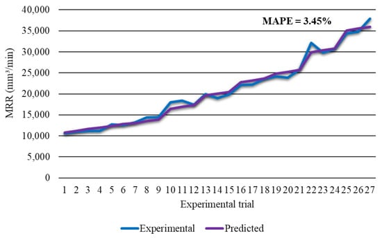Figure 13 confirms high prediction accuracy of developed regression model for material removal rate with calculated MAPE of 3.45% and R2 of 0.987. In order to define significance of process parameters and their interactions, ANOVA was carried out. Results of ANOVA are presented in Table 10.