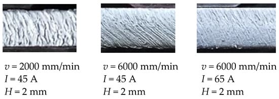 Regarding surface roughness characteristics Ra and Rz ANOVA highlights that cutting speed and arc current as well as their interaction have significant effect on the process response. Other parameters and interactions do not affect significantly surface roughness characteristics Ra and Rz. Cut surface roughness formation in plasma jet cutting process is mainly induced by molten metal fluctuation, flow perturbation of plasma jet, cutting torch vibration and motion of anode spots within the groove of cut [40]. Response surfaces and contour plots from Figure 10 present that increase of the cutting speed results with the decrease of the surface roughness Ra and Rz. Increase of the cutting speed leads to the more intensive fluctuation of the molten metal that results with the lower surface roughness of the cut. Furthermore, at lower cutting speeds motion of anode spots appears and that results with the higher roughness [40]. The same trends were shown in [6,14,40]. Regarding arc current effects from Figure 10 it is visible that at low cutting speed (2000 mm/min) increase of the arc current results with the higher cutting energy and increase of the surface roughness. Fluctuation of the molten metal from the groove of the cut is less intensive and that leads to the rougher cut surface [40]. At high cutting speed (6000 mm/min) increase of the arc current leads to the slightly decrease of the surface roughness. Higher cutting energy combined with the more intensive fluctuation of the molten metal result with the lower surface roughness [40]. Figure 16 shows surface roughness obtained at different process parameters values. According to the above derived assertions in order to achieve minimal surface roughness Ra and Rz plasma jet cutting process needs to be concentrated in the area of the higher cutting speeds (>4000 mm/min) and higher arc currents (>65 A).