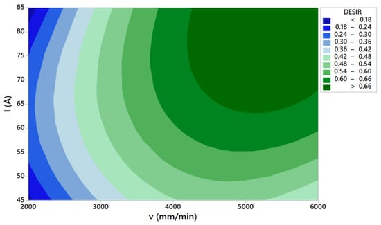 Figure 17 shows desirability contour plot for multi-objective optimization. Optimal cutting area is the area with the highest composite desirability values. This area is marked in the contour plot with the darkest green color. This optimal cutting area is also visible in Figure 18 as white colored zone.