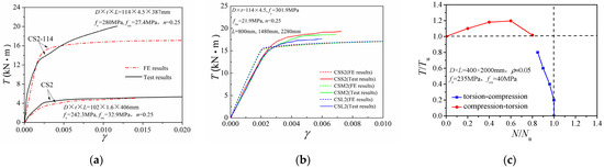 Figure 3 displays the comparison of the N/Nu~T/Tu correlation curves from the FE results and test data. The FE results were slightly higher than the corresponding experimental values, but they followed similarly varying trends. For the specimens with a low steel ratio (C.S. series, ρ = 4.5%), as the axial compression ratio increased, the torsional bearing capacity increased at first and then decreased. Conversely, for specimens with a high steel ratio (CSS, CSM, and CSL series, ρ = 17.8%), the torsion strength decreased slowly, with an increase in the axial compression ratio. Since in practical projects the steel ratio of CFST columns is generally low (ρ < 10%), investigations on low-steel-ratio cases are critical. Hence, only the low steel ratio specimens we subject to further investigations in terms of compression-torsion properties.