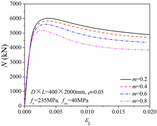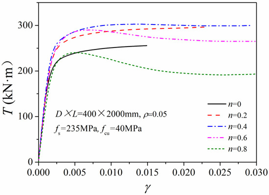 With the axial capacity Nu and torsional strength Tu, we can realize different torque ratios (m = T/Tu) and axial pressure ratios (n = N/Nu) in numerical simulations by changing the applied axial and the torsional forces. Figure 4 shows the relationship between axial force N and the average longitudinal strain εL of the columns under different torque ratios (m = T/Tu). With different axial pressure ratios, the initial stiffness remained almost constant. Moreover, as the applied torque T gradually increased, the torsional capacity continued to decrease. Figure 5 gives the relationship of torsional strength T to averaged shear strain γ (T–γ curve) under different axial pressure ratios (n = N/Nu). The shear stiffness of the column under combined compression-torsion conditions was nearly the same as that under pure torsion conditions. In addition, with an increase in the axial compression ratio, the ultimate torsional strength first increased and then decreased.