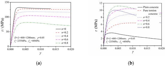 τ–γ relation of the steel tube and concrete under different axial compression ratios: (a) Steel tube; (b) core concrete.