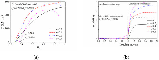 In summary, the mechanics of a circular CFST column under compression-torsion can be regarded as a combination of “pulling (compressive) torsion” at the steel tube and “compressive torsion” at the concrete. Due to the composite effect of the steel tube and the concrete under axial force, the maximum shear stress at the core concrete increased significantly while shear stress at the steel tube gradually reduced. Therefore, as the axial compression ratio increased, the torsion capacity of the compression-torsion column initially increased and then gradually decreased.