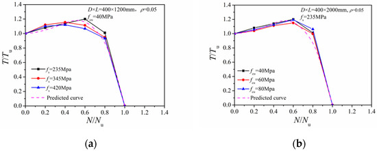 Here φ is the confinement index coefficient, φ = Asfs/Acfc. The pure torsional strength of these circular CFST columns can also be obtained with Equation (2), proposed by Ding et al. [27]